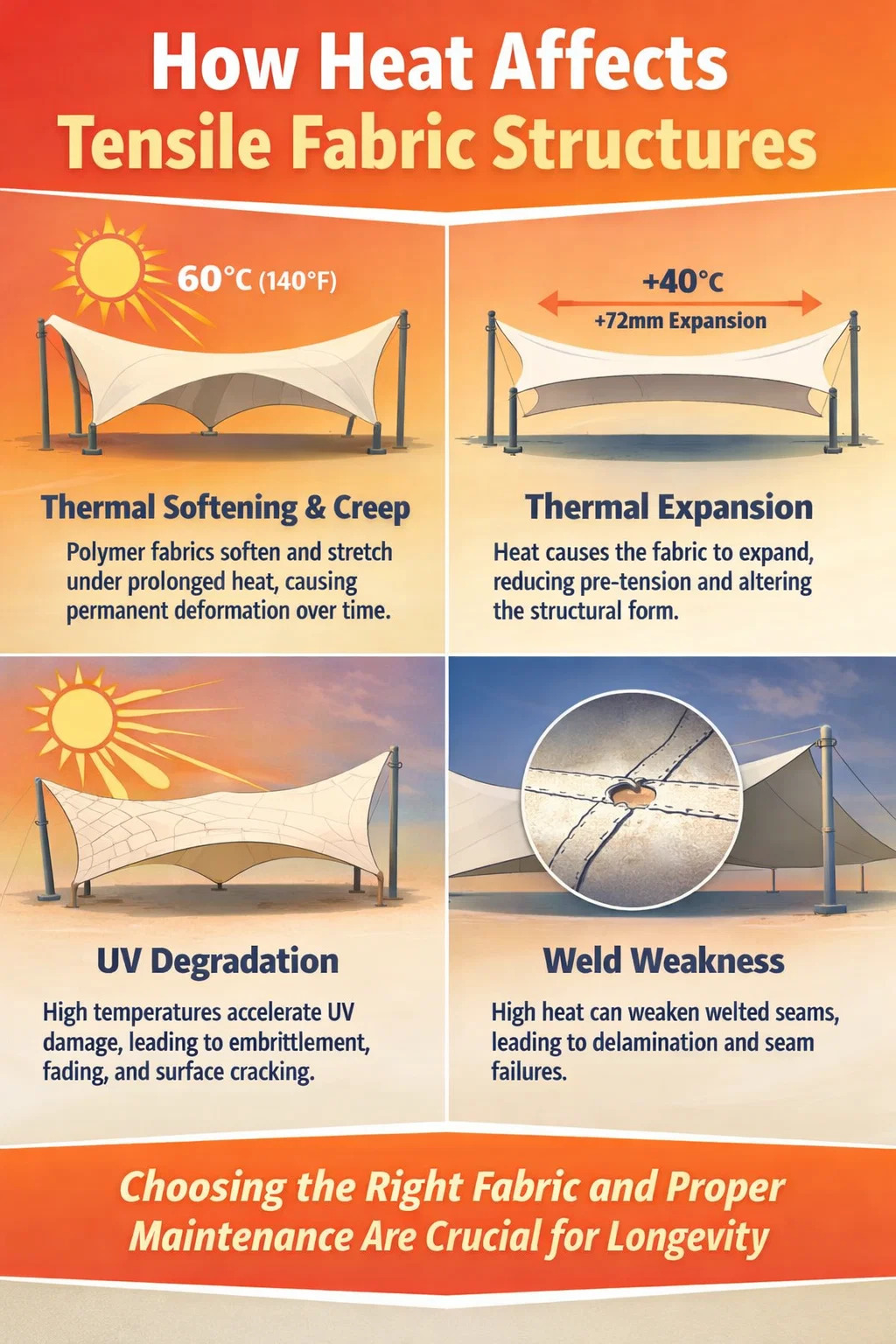 Struktury tkanin rozciągliwych zależą od precyzyjnie skalibrowanego naprężenia wstępnego, aby zachować swój kształt, prawidłowo odprowadzać wodę i wytrzymać unoszenie wiatru. Ciepło powoduje rozszerzanie się tkaniny; chłodzenie powoduje jego kurczenie się. Współczynnik rozszerzalności cieplnej tkaniny rozciągliwej z PVC wynosi w przybliżeniu 0,18 mm na metr na stopień Celsjusza . Na przestrzeni 10 metrów wahania temperatury wynoszące 40°C – typowe od nocy do południa w gorącym klimacie – powodują zmianę wymiarów o około 72 mm. Inżynierowie budowlani biorą to pod uwagę przy doborze kabli krawędziowych, łączników narożnych i osprzętu napinającego, ale nieodpowiednie specyfikacje prowadzą do zwiotczenia latem i nadmiernego naprężenia w zimie, co skraca żywotność tkaniny.