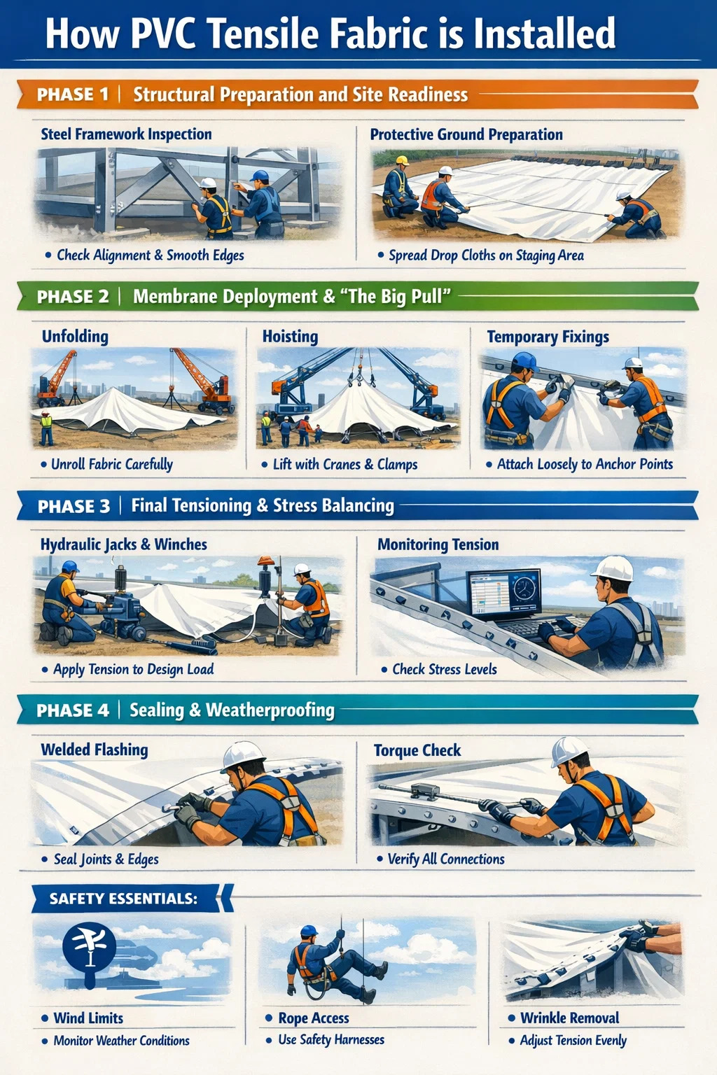 A Tkanina rozciągliwa PCV struktura jest „strukturalna” tylko wtedy, gdy jest pod napięciem. Bez odpowiedniego naprężenia tkanina trzepotałaby na wietrze, powodując zmęczenie i ewentualne uszkodzenie. Ta faza polega na pociągnięciu tkaniny do siebie poziom stresu wstępnego , zazwyczaj od 1,0 do 5,0 kN/m w zależności od wymagań inżynieryjnych.