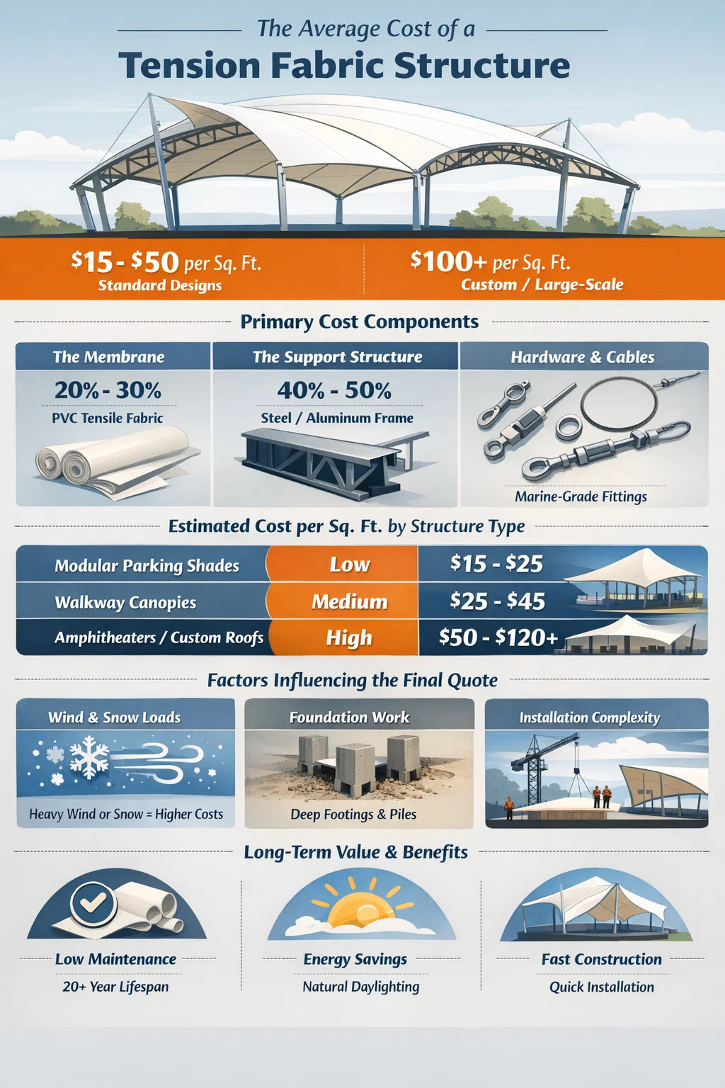 Tkanina zwykle stanowi 20% do 30% całkowitego kosztu projektu. Standardowe Tkanina powlekana PCV jest najbardziej ekonomicznym wyborem. Cena różni się w zależności od gramatury (zwykle od 700 g/m² do 1500 g/m²) i wykończenia powłoki nawierzchniowej. Membrana pokryta PVDF kosztuje więcej niż zwykłe wykończenie akrylowe, ale oferuje znacznie lepsze właściwości samoczyszczące i dłuższą żywotność, często sięgającą 20 lat.