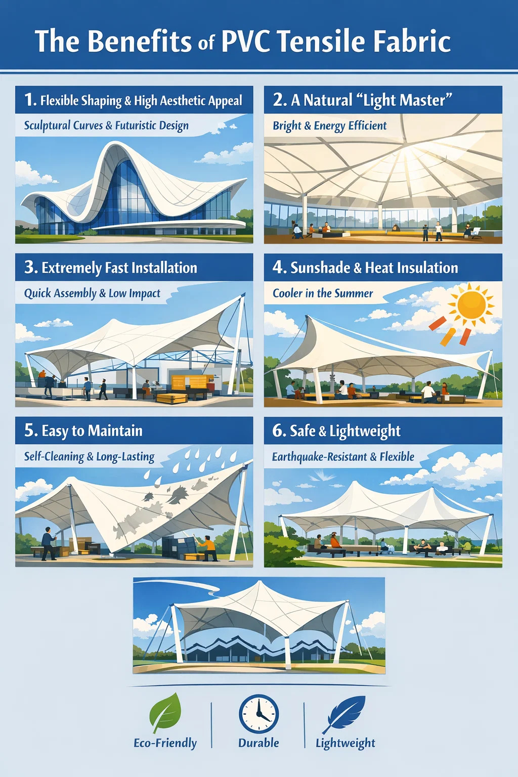 Mówiąc o zaletach Tkanina rozciągliwa PCV Jego popularność w nowoczesnej architekturze, szczególnie na stadionach, placach plenerowych i zacienieniu krajobrazu, wynika z wielu unikalnych zalet w porównaniu z tradycyjnymi materiałami.
