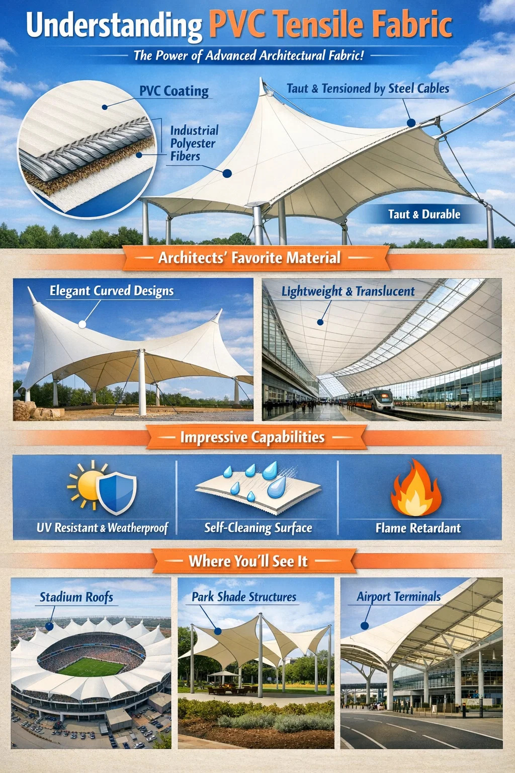 Wszechstronne kształty: można go rozciągnąć w kształty siodła, kształty namiotu lub różne eleganckie krzywizny. Często można zobaczyć te artystyczne kształty na stadionach, teatrach na świeżym powietrzu lub wysokiej klasy konstrukcjach parkingowych.