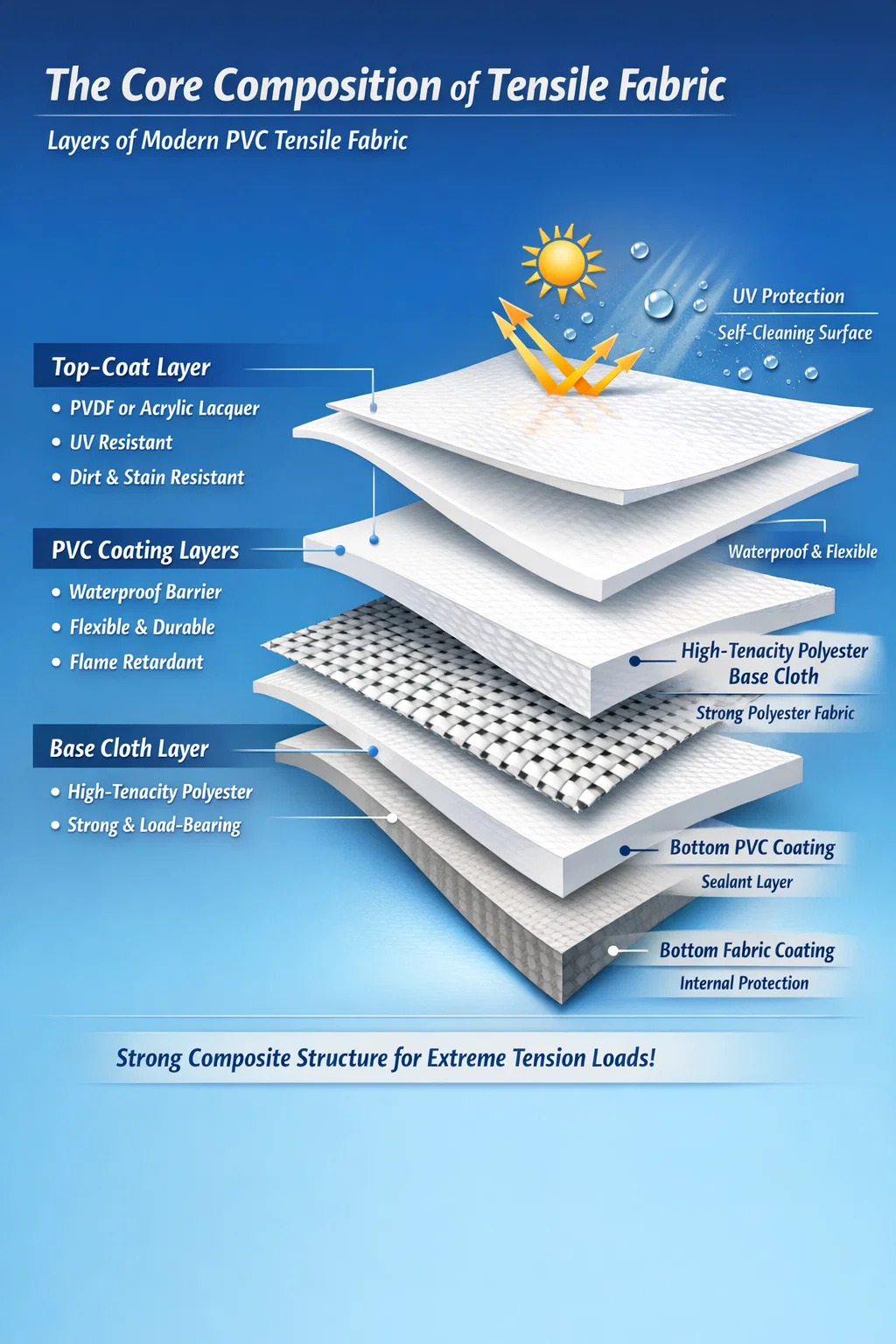 Najbardziej nowoczesny Tkanina rozciągliwa PCV to wyrafinowany materiał kompozytowy składający się z trzech podstawowych warstw: a poliestrowa tkanina bazowa o wysokiej wytrzymałości , gruby Powłoka z PCV (polichlorku winylu). i specjalistyczne lakier nawierzchniowy takie jak PVDF lub akryl. Wewnętrzna tkanina zapewnia wytrzymałość konstrukcyjną pozwalającą wytrzymać ogromne obciążenia rozciągające, podczas gdy zewnętrzne warstwy tworzywa sztucznego chronią włókna przed degradacją środowiska, wodą i ogniem.