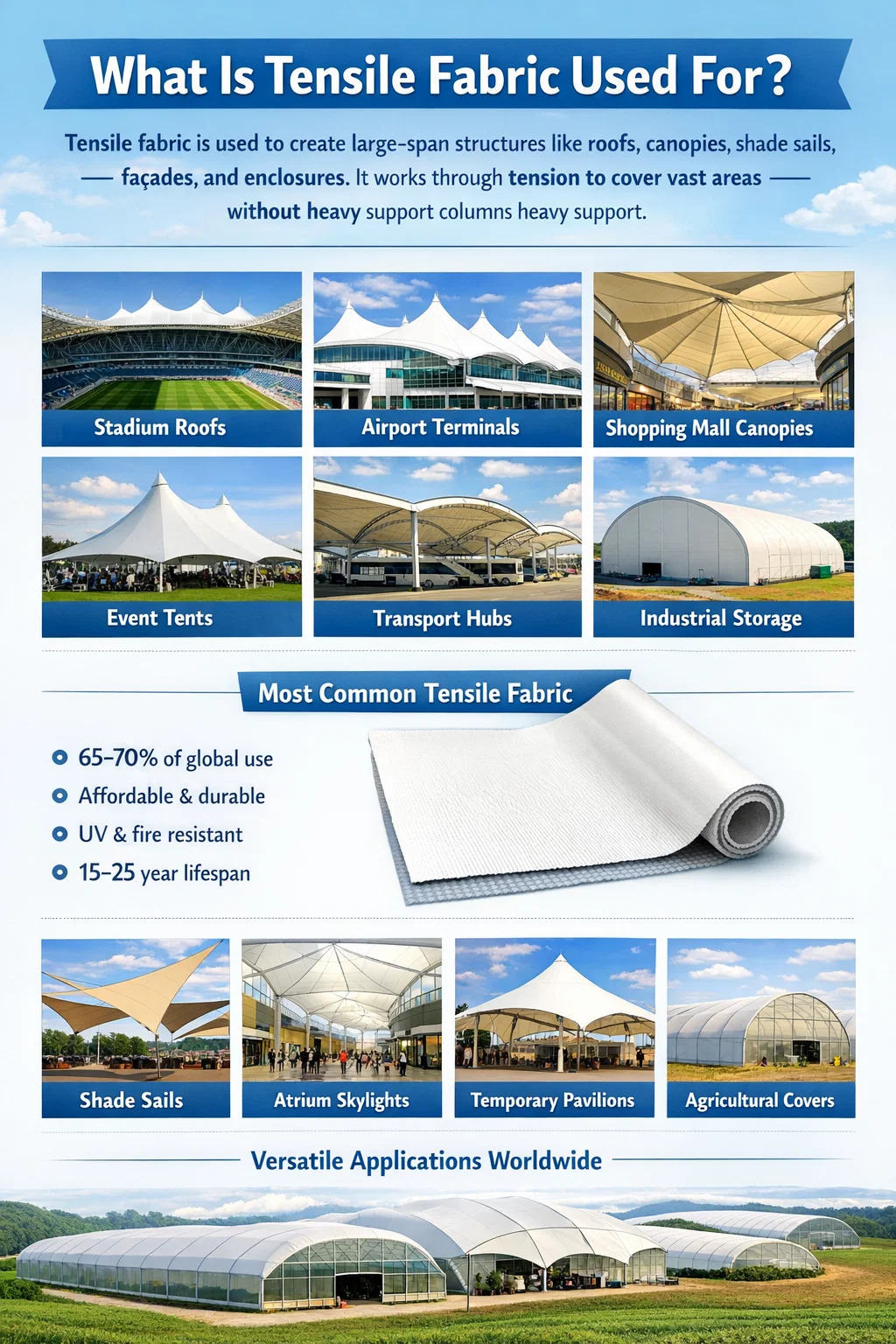 | Poliester powlekany PCV | Przędza poliestrowa | 15–25 lat | 15–45 USD | Eventy, zadaszenia, stadiony, przemysłowe |