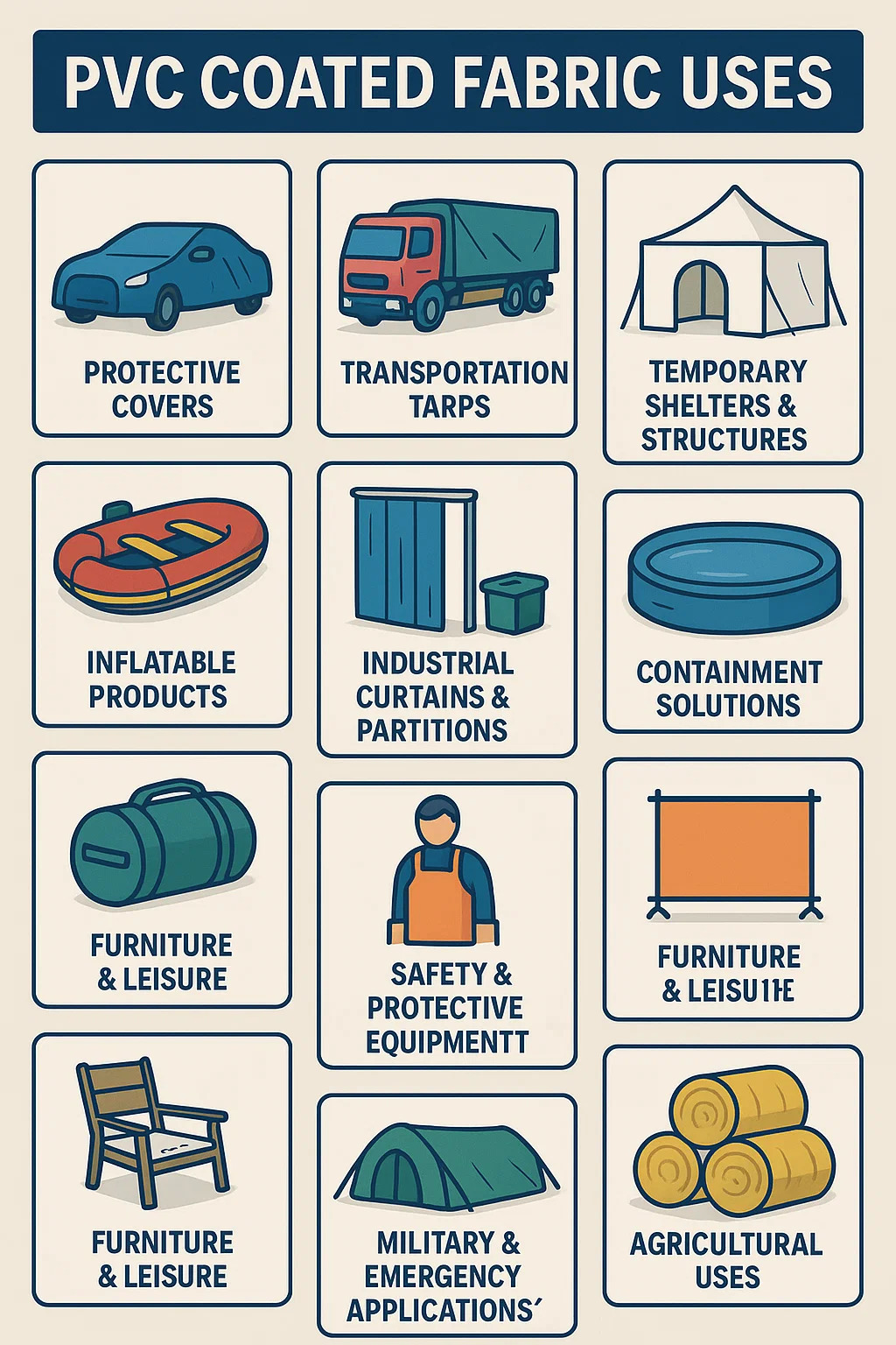 Oto zestawienie typowych zastosowań Tkanina powlekana PCV , odzwierciedlając jego praktyczne zastosowania: